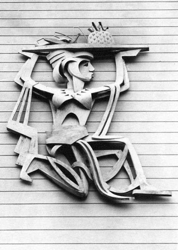 De gevelsculptuur verbeeldt de Surinaamse vrouw als spil van het maatschappelijke- en economische leven. Het is ontworpen door Erwin de Vries en is een van zijn eerste werken.