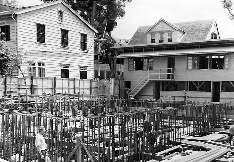 Tijdens de bouw van de HBU Bank gebruikte men nog zachtstaal en daarom moest er tweemaal zoveel betonijzer worden toegepast als tegenwoordig. Maar het betonijzer kon men toen nog met de hand buigen. Het storten van beton duurde zesendertig uur wegens de geringe capaciteit van de betonmolen en moest in ploegendienst uitgevoerd worden om zo een compact geheel te verkrijgen zonder overgangen. Op 22 februari 1957 werd er door mevrouw M.E. Rost Onnes-de Visser, de vrouw van de bankdirecteur, een gedenksteen gelegd. Na het voordragen van een oorkonde door Lou Lichtveld legde de heer Rost Onnes de oorkonde samen met de gangbare munten en postzegels van Suriname in een holle gevelsteen, waarna de gedenksteen erbovenop geplaatst werd.