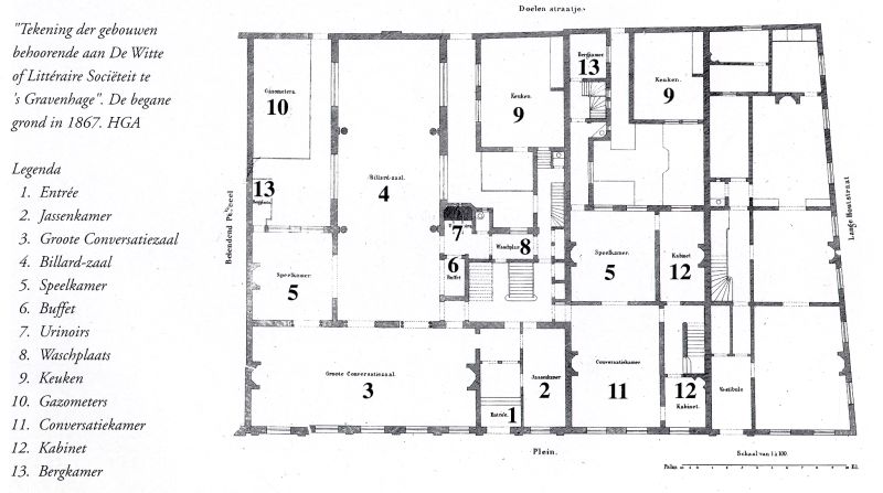 In 1802 werd de Nieuwe of Littéraire Sociëteit opgericht in een koffiehuis aan het Plein in s-Gravenhage. Aangezien de gevel van het koffiehuis wit was, kreeg de sociëteit al gauw als bijnaam: De Witte. Na een aantal jaren dit koffiehuis gehuurd te hebben ging de sociëteit over tot het kopen van het pand. Dat gebeurde in 1820. De groeiende behoefte aan ruimte maakte dat er verschillende verbouwingen en uitbreidingen hebben plaats gehad in het voormalige koffiehuis. Een belangrijke verbouwing vond plaats tussen 1848 en 1850 waarbij E. Saraber opzichter was bij deze werkzaamheden, sindsdien was hij de vaste technische adviseur voor de sociëteit. De sociëteit kreeg als uitbreiding twee zalen aan de achterzijde en werd verder grondig gerenoveerd. Op 5 december 1850 werd het gebouw feestelijk geopend met een soiree dansante.