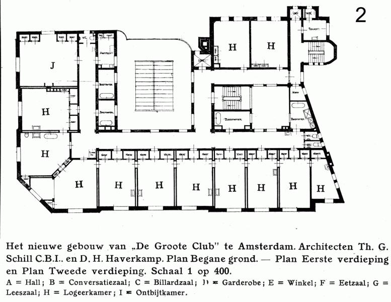 Th.G. Schill maakte in 1912 een ontwerp voor de gevels van het sociëteitsgebouw van De Groote Club maar dat werd afgekeurd door de Dam-Raadhuiscommissie. Schill en Haverkamp maakten in 1914 een nieuw ontwerp. Uiteindelijk werden de gevels niet door Schill en Haverkamp ontworpen maar door de architect D.F. Slothouwer. Het gebouw met zijn achthoekige hoektoren kreeg de bijnaam 'Molen zonder Wieken'. Het souterrain was geheel uit beton gemaakt en bestond uit: ruimten voor de installatie van de centrale verwarming, van de ventilatie, en van de stofzuigmachine, bier- en wijnkelders, drie winkelkelders, barbiersalon, spreek- en kleedkamers, werkplaats voor de machinist, bergruimten en toiletten. Op de begane grond waren de hoofdvertrekken: de hal, de conversatiezaal, de biljartzaal en drie winkels. De hal werd verlicht door een bovenlicht en door een groot raam met glas-in-lood. Het glas-in-loodraam, dat een park met een bank voorstelt, werd ontworpen en uitgevoerd door de firma Jan Schouten uit Delft. De hal heeft een marmeren vloer, een kleurige marmeren lambrisering, en twee marmeren zuilen. De belangrijkste zaal is de conversatiezaal met uitzicht op de Dam. De plattegrond van de zaal bestaat uit twee loodrecht op elkaar geplaatste rechthoeken, met op de scheiding twee grote zuilen. De wanden hebben een stofbehandeling gekregen op de natte verf in bepaalde patronen, waardoor het effect van een doekbespanning is verkregen. De biljartzaal heeft een eikenhouten lambrisering met daarboven een fries van Japans papier. Op de eerste verdieping bevinden zich de belangrijkste ruimten: de leeszaal uitgevoerd in donker mahoniehout, een speel- en conversatiezaal en een grote biljart- en eetzaal. De biljart- en eetzaal met wit stuc werd ontworpen en uitgevoerd door de Engelse firma Waring en Gillow. Op de eerste verdieping bevinden zich 17 logeerkamers, 4 badkamers, en ook de ontbijtkamer, de buffetten e.d. Op de derde verdieping is de keuken met spoel- en bijkeuken geplaatst en verder de slaapkamers van het personeel, het archief en bergplaatsen. Op 22 mei 1912 werd er begonnen met de sloop van het oude gebouw. 28 november 1914 werd het nieuwe gebouw voltooid opgeleverd. Het is het eerste gebouw in Nederland dat elektrisch geheid werd.De hoofdaannemers waren Reinders en van 't Ende. Chef van de bouwleiding was J.P.W. Bieling. Schill overleed 15 oktober 1914 en kon de opening van het nieuwe gebouw niet meemaken. In 1921 werd de Sociëteit Doctrina et Amicitia, die ernaast was gevestigd, verenigd met De Groote Club. Het oude pand van Doctrina et Amicitia werd in 1929 afgebroken en in 1931 vervangen door een gebouw naar ontwerp van Slothouwer. Op de gootlijst is de tekst '1802 Doctrina et Amiciatia 1931' aangebracht. Het eerste jaartal verwijst naar een verbouwing, het tweede naar de vervanging van het pand door Slothouwer.