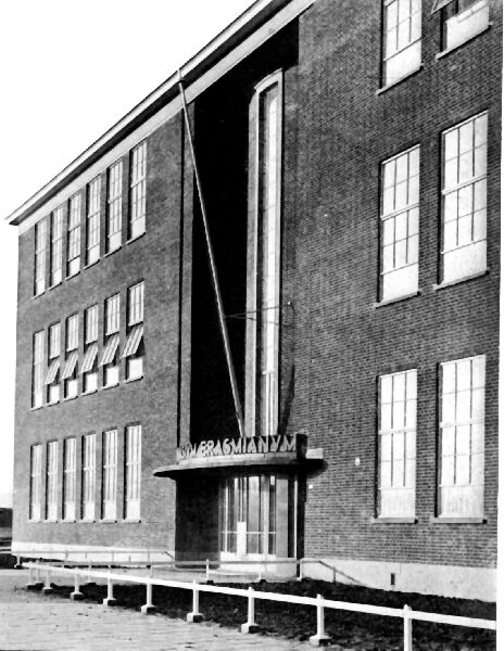 De economische crisis veroorzaakte veel oponthoud bij de totstandkoming van dit gebouw. Na zeven jaar van voorbereiding werd het schoolgebouw in anderhalf jaar voltooid. Stedenbouwkundig vormt het gymnasium de voortzetting van het naastgelegen kantoorgebouw van Unilever. Zo hield Van der Steur rekening met de schaal en de hoogte van dat kantoorgebouw door voor de school eveneens drie verdiepingen te ontwerpen. De vorm van het terrein en de ligging ten opzichte van het zonlicht deden hem besluiten de schoolvleugel langs de Wijtemaweg te projecteren. Door de situering van schoolvleugel, gymnastiekzalen en fietsenstalling kon de tuin van de school aansluiten op die van Unilever en werd deze door het kantoorgebouw van Unilever tegen de wind beschut.De gevels zijn van roodbruine bakstenen op een plint van Scandinavisch graniet. De hoofdingang krijgt een bijzonder accent doordat deze van de begane grond tot aan de kroonlijst inspringt, terwijl de zandstenen luifel boven de deur juist tot buiten de rooilijn naar voren springt en de ingangspartij boven de kroonlijst wordt voortgezet in een halfronde dakkapel. Het dak heeft een flauwe helling en is met grijze leislag bedekt. De ramen zijn in staal uitgevoerd op onderdorpels van zandsteen. Om in de gangen zoveel mogelijk licht te krijgen zijn de wanden boven deurhoogte geheel van glas en staal. De zij-ingang heeft boven de luifel een grootfries met de kop van Erasmus. De randen van de deze luifel en die van de hoofdingang zijn met koper bekleed.Met een opvallende plint als basement, de pilasters tussen de vensters en de kroonlijst straalt het gebouw een classicistisch karakter uit, waarbij de aan de linkerzijde in de voorgevel geplaatste ingangspartij en de ongelijke vensters in de zijgevels voor asymmetrische accenten zorgen. Opvallend zijn de zeven lancetvormige vensters aan de zijkant die over twee verdiepingen doorlopen en tot halverwege de kroonlijst doordringen.Recentelijk zijn er nieuwe kozijnen van kunststof geplaatst, waarmee de accenten die Van der Steur in het gebouw legde verloren zijn gegaan. Ook is de roede-indeling drastisch veranderd. Door een uitbreiding is ook de mooie aansluiting van tuin en gebouw met het Unilever-gebouw verloren gegaan.