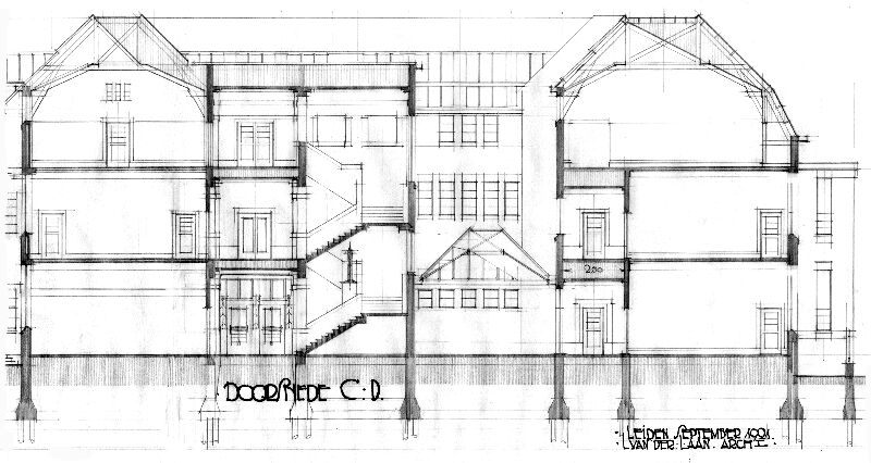 Het meest monumentale schoolgebouw dat bureau Van der Laan heeft ontworpen is het nooit uitgevoerde ontwerp voor Genootschap Mathesis Scientarium Genitrix (Wiskunde is de moeder van alle wetenschappen) aan de Pieterskerkgracht en Lokhorststraat te Leiden uit 1921. Het genootschap was sinds 1867 in hetzelfde neorenaissancistische gebouw als de HBS gehuisvest. Door de groei van het aantal leerlingen was deze school evenwel te klein geworden en werd opdracht gegeven tot de bouw van een nieuwe school. Deze werd uiteindelijk pas in 1966 opgeleverd aan de Dieperpoellaan. Het MSG bood jongens een technische opleiding aan, aanvankelijk alleen in de avonduren maar later ook met een dagopleiding. Het lijkt waarschijnlijk dat Leo van der Laan verantwoordelijk is geweest voor het verkrijgen van de opdracht, maar dat Jan het ontwerp maakte - een van zijn studietekeningen uit 1921, gemaakt tijdens zijn studie aan de TH Delft, is vrijwel identiek aan dit ontwerp. Deze wijze van samenwerking typeert bureau Van der Laan in de jaren twintig en dertig. Leo houdt zich dan voornamelijk met de zakelijke en technische aspecten van het bureau bezig, terwijl Jan zich vooral op de vormgeving richt. De monumentale hoofdgevel van de school aan de Pieterskerkgracht bestaat uit een entresol, twee bouwlagen en een hoog mansardeniveau. De risaliet in het centrum van de gevel bevat een imposant toegangsportaal met verdiepte en verhoogde deuren. De muurdammen zijn versierd met verticaal gelede ornamenten en versieringen in de vorm van masthouders en lantaarns. De overgang van de tweede bouwlaag naar het mansardeniveau wordt geaccentueerd door een borstwering. Het trappenhuis en een met glas overdekte binnenplaats bevinden zich in het centrum van de school. Hier omheen liepen concentrische gangen met lokalen. Het hoofdgebouw zou worden gebruikt voor theorielokalen; de zolderverdieping was bestemd voor ateliers die werden belicht door middel van een ingenieuze kapconstructie bestaande uit spanten, glas en een kleinere kap.