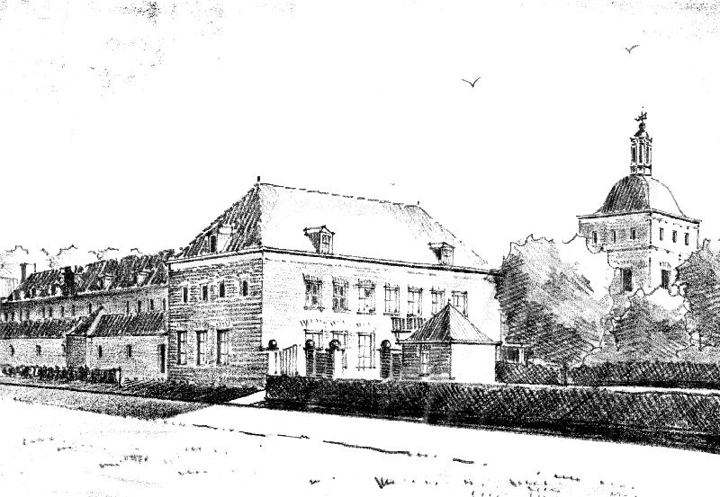 Groot complex bestaande uit als een dominospel aan elkaar gelegde stroken traditionele gebouwen. Deze traditionele stroken zijn drie bouwlagen hoog en uitgevoerd met een metselwerkgevel met hoge bvensters en door roeden verdeelde ruiten. Over de stroken loopt een pannen zadeldak. Bij de kapel is een toren ontworpen.
