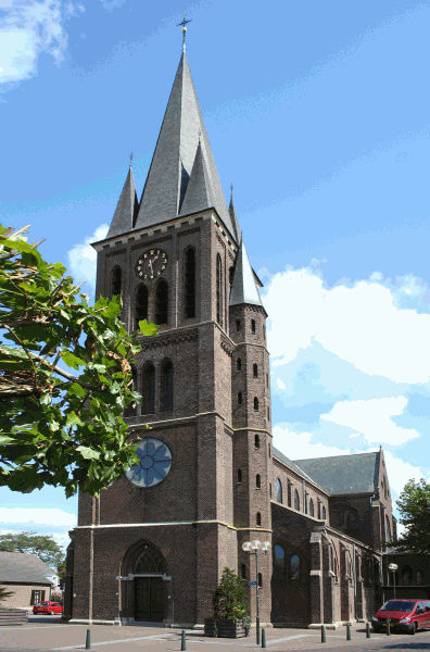 Deze kerk uit 1868 is ontworpen door P.J.H. Cuypers; zij is een kruisbasiliek met drie beuken. De kerk is geheel opgetrokken in baksteen met kruisribgewelven, gevelopeningen in vroeggotische trant. Voor het schip is een zware toren geplaatst met daarin, net als in de eindgevels van het transept, een groot rozetraam. Tijdens de Tweede Wereldoorlog is de kerk in 1944 vrijwel geheel verwoest. Zij is in 1954 herbouwd onder leiding van Pierre Weegels.