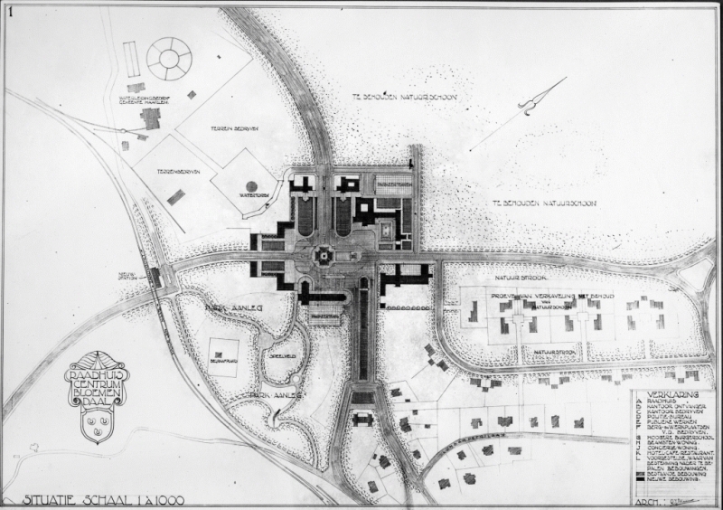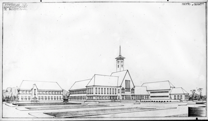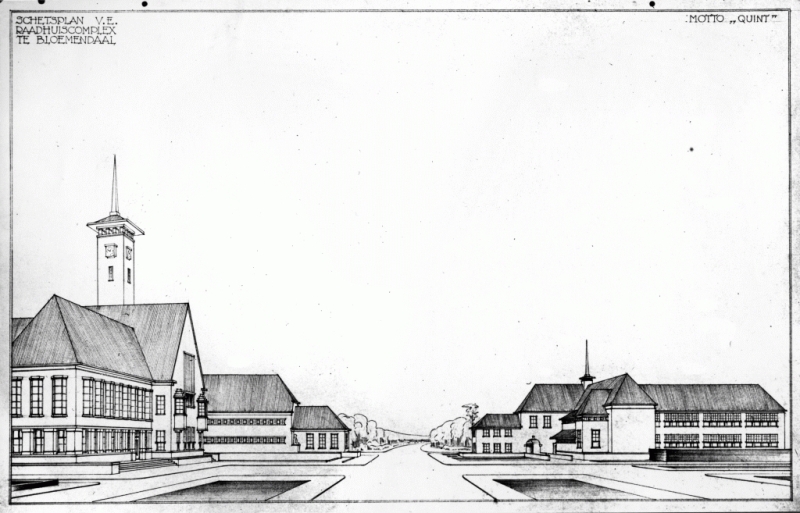 Meervoudige opdracht opgedragen aan zeven architecten voor het maken van een schetsplan voor een nieuw stadhuis, een bureau voor publieke werken, een bureau voor bedrijven, een politiebureau en een lagere school. De commissie van advies bestaande uit de architecten J. Gratama, A.R. Hulshoff en J. de Jongh beoordeelde de plannen van de uitgenodigde architecten C.J. Blaauw, A. Boeken, H.W. van Kempen, J.P.L. Hendriks (vervanger van A.P. Smits), A.J. van der Steur, H.Th. Wijdeveld en van het architectenbureau Mulder en Van Asdonk, dat op verzoek van de raad werd toegevoegd. In het beoordelingsrapport van de Commissie werd geadviseerd om de ontwerpers van motto's 'C.C.' en 'Quint' te verzoeken opnieuw een schetsplan te maken, nu rekening houdend met nieuwe wensen van de Bouwcommissie, o.a. voor een caf?-restaurant en een Hoogere Burgerschool. De nieuwe plannen, gemaakt door resp. Van der Steur en Blaauw, werden beoordeeld en Blaauw kreeg uiteindelijk de opdracht zijn voorstel verder uit te werken.De ontwerpen voor het raadhuis te Bloemendaal werden ge?xposeerd in de toonzalen van de firma Boskamp te Overveen.