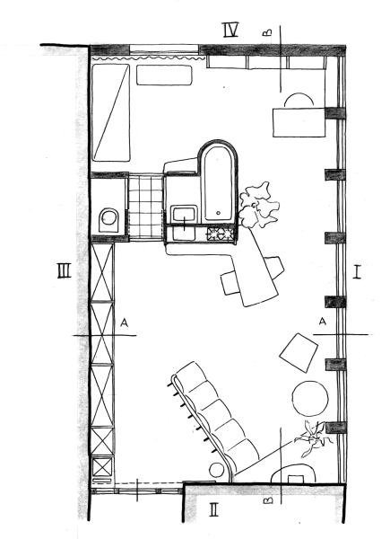 Ontwerp gemaakt tijdens de opleiding VHBO, klasse III-0 voor docent P.H. Hekkema. Een open plattegrond met dwars geplaatste sanitaire en kookvoorzieningen, die het slaapdeel van het woondeel scheiden.