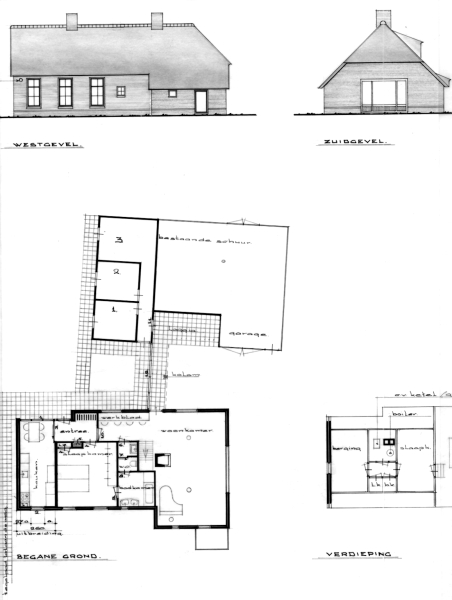 De verbouwing van dit huisje bestond uit twee fasen. De eerste fase dateert van rond 1962, de tweede van 1969-1970. Tijdens de eerste fase kwamen aan de zuidzijde de woonkamer met grote glaswand tot stand, een open verbinding naar keuken aan oostzijde en aan de noordzijde een studeerkamer. Op de ontwerpen van 1969-1970 staat een open haard voor de woonkamer en is de keuken gesitueerd aan de noordgevel. Tussen keuken en woonkamer ligt de grote slaapkamer met al eerder aanwezige sanitaire voorzieningen. Er bestaan ook schetsen voor logeerkamers, grenzend aan de belendende schuur.