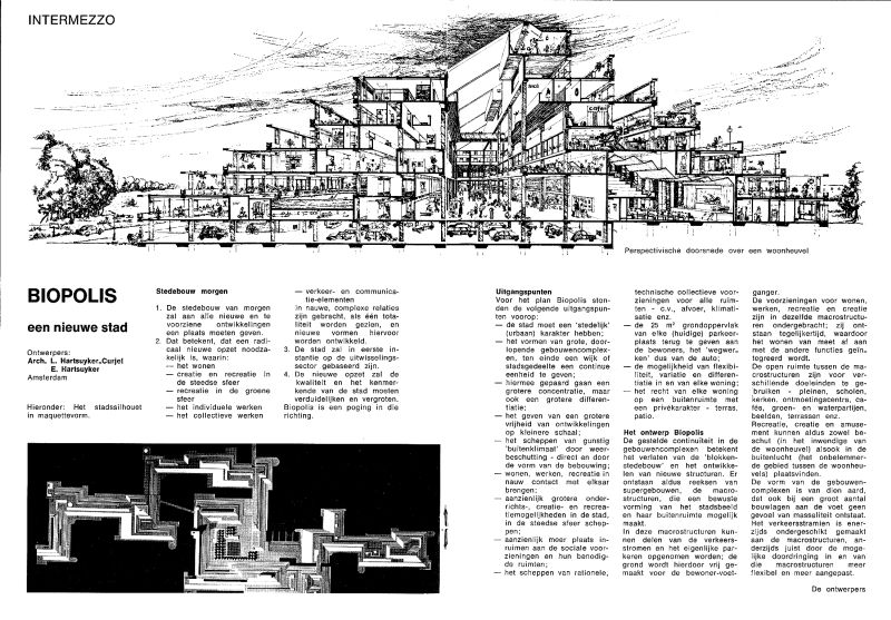 Het woord Biopolis staat voor een biologisch verantwoorde stad waarin de samenhang tussen de verschillende functies centraal staat in plaats van de te ver doorgevoerde scheiding tussen wonen-werken-verkeer en recreatie. Om dit idee?nplan vorm te geven, formuleerden de Hartsuykers een aantal uitgangspunten. Deze zijn: doorlopende bebouwing en vorming van samenhangende buitenruimten; het ondergeschikt maken van het autoverkeer en oplossen van het parkeervraagstuk; volledige stedelijke voorzieningen voor wonen, werken, ontspanning, creatie, verplaatsing en ruimtelijke vervlechting daartussen; individueel wonen in groter verband; woningen met de voordelen van een flat met goede collectieve voorzieningen en priv? buitenruimte; bescherming tegen het heersende Nederlandse klimaat door overdekte openbare ruimten, pleinen en wegen. Aan deze uitgangspunten is vorm gegeven met 'heuvelvormige' constructies ('macrostructuren' genoemd door de Hartsuykers), waar aan de buitenzijde de woningen met hun terrassen liggen, aan de overdekte binnenzijde de nevenfuncties van wonen (bergingen, hobbyruimten, werkkamers, winkels etc.) en van werken (kantoren, ateliers, werkplaatsen etc.) en op de begane grond de parkeergarages. De constructie van de woningen staat in het ontwerp in principe los van de constructie van de 'heuvel'. De omvang van de woningen staat daardoor niet vast en kan al naar gelang de behoefte worden aangepast. De Hartsuykers hebben ter illustratie drie woningplattegronden gemaakt, waarvan ??n ge?nspireerd op 'woning 1974'. In navolging van eerdere voorstellen van Le Corbusier en Friberger (Zweden) achten de Hartsuykers het goed mogelijk om delen van een etage (door de Hartsuykers 'dek' genoemd) te kopen of te huren en zelfstandig te bouwen en in te delen.