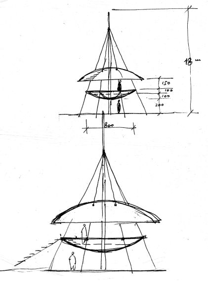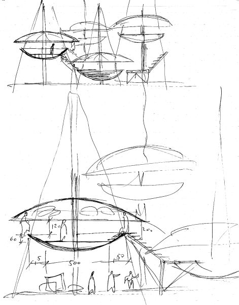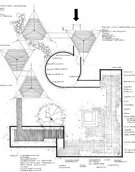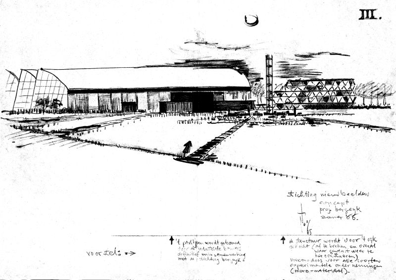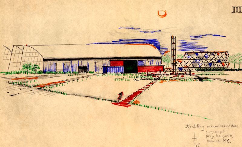 Het ontwerp bestond uit vier zeshoekige podia en een cirkelvormig podium, die qua ligging op verschillende hoogtes waren gepland. Met de koepelvormige overkappingen maakten de paviljoens een speelse indruk, beantwoordend aan de creatieve doelstelling van de Stichting Nieuw Beelden. Elk paviljoen had een eigen thema: holwoningen, nieuwe woon- en leefmogelijkheden, nieuwe structuren en oplossingen, nieuwe technieken, voorlopers. Op het terrein voor de Ploegfabriek was ook plaats voor een rechthoekige pergola, waarin diverse voorbeelden van menselijke nederzettingen te zien waren. Dit ontwerp is nooit uitgevoerd. Slechts enkele objecten waren te zien bij de entree van het congres, zoals een foto van de Venus van Willendorf, het beeld Gezin van Carel Visser en een tekening van Conrad Waxman over ruimtelijke structuren.