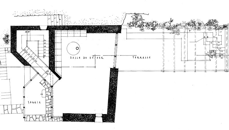 Verbouwing van bestaand oud huisje. Aan de zuidoostzijde is een smalle aanbouw gemaakt,alwaar zich de entree bevindt met daarboven een vide en een loggia. De verbindende trap staat onder ongeveer 45 graden (zie hiervoor ook het artikel Trap van R. Bullhorst). De indeling in de woning met beneden de gastenkamer, eetkeuken en slaapkamer op de eerste verdieping met overdekt terras, en woonruimte met open terras op de tweede verdieping met prachtig uitzicht, wijkt af van traditionele indelingen en is goed doordacht. De perspectieftekeningen laten zien hoe er met de ruimte gewoekerd is.