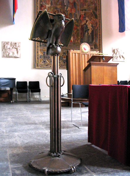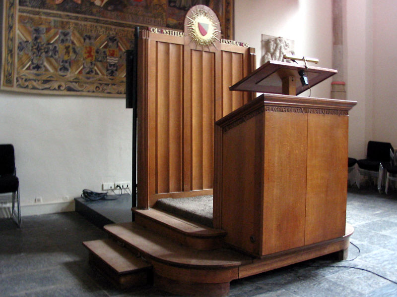 | Bijdragen: | Nicolas, J.A.H.T. -glas-in-lood (de deugden)-, Termote, A.P. -beeldhouwwerk (Minerva)-, Bus, D. -beeldhouwwerk (Sint Maarten)-, Konijnenburg, W.A. van -gobelins-, Moor, Chr. de -kartons gobelins (de zeven faculteiten)-, |