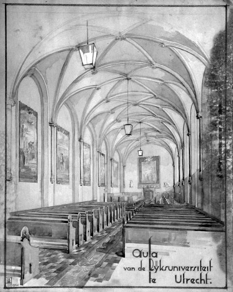 De Aula (ook Groot Auditorium genoemd) van de Rijksuniversiteit van Utrecht was oorspronkelijk een kapittelhuis en bestond al voor 1409. In 1634 werd de Aula in twee delen gescheiden en in gebruik genomen door de nieuw opgerichte hogeschool van Utrecht. In 1815 werd deze hogeschool tot rijksuniversiteit verheven en werd de Aula verbouwd. Tussen 1876-1879 verrichte P.J.H. Cuypers (1872-1921) de eerste restauratie, waarbij hij trachtte de Aula, in overeenstemming met zijn restauratietheorie, zoveel mogelijk in de toestand van het einde van de vijftiende eeuw terug te brengen. De gewelfschilderingen en de op de westmuur aanwezige wapenschilden werden hersteld. De zeven vensters kregen gotische stenen traceringen. Tegelijkertijd werden tapijtmotieven aangebracht en werden de kapitelen met bonte kleuren en goud beschilderd.