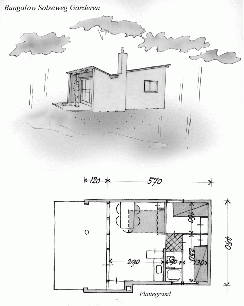 Kleine vakantiewoning in Garderen op de Veluwe. Deze bijzonder kleine bungalow voor vier personen meet 4,5 x 5,7 meter, met een hoogte van min 2m30. Een functionalistisch gebouwtje met een opvallende dakvorm. Het schuine dak heeft zijn laagste punt aan de gevel bij het terras. Hierboven loopt een luifel schuin omhoog, hierdoor een puntdak met de punt naar beneden vormend. Alleen een schetsontwerp is bekend, of het project ooit is uitgevoerd is onbekend.