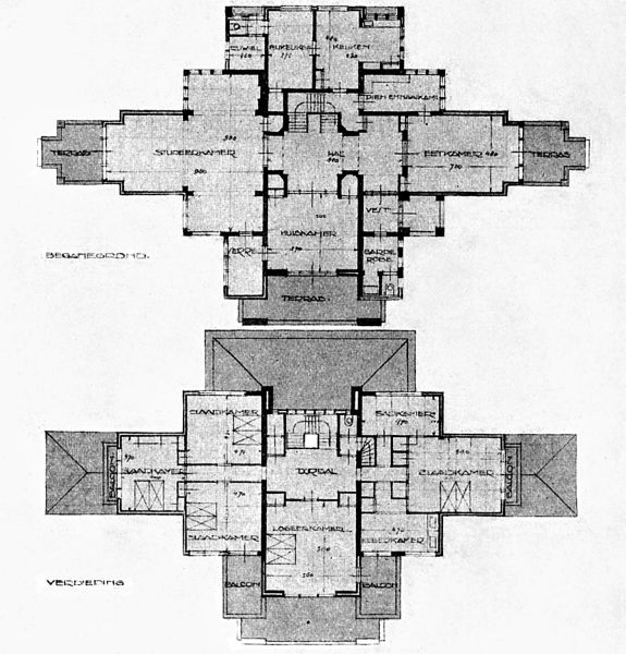 Landhuis in een door Frank Lloyd Wright ge?nspireerde stijl. De plattegrond is symmetrisch, met een centraal gelegen hal op de begane grond. Het het huis is samengesteld uit een aantal rechthoekige volumes met breed overstekende, licht hellende daken. De woning wordt geflankeerd door twee overdekte terrassen. Het ontwerp is in Wendingen gepubliceerd, maar niet uitgevoerd.
