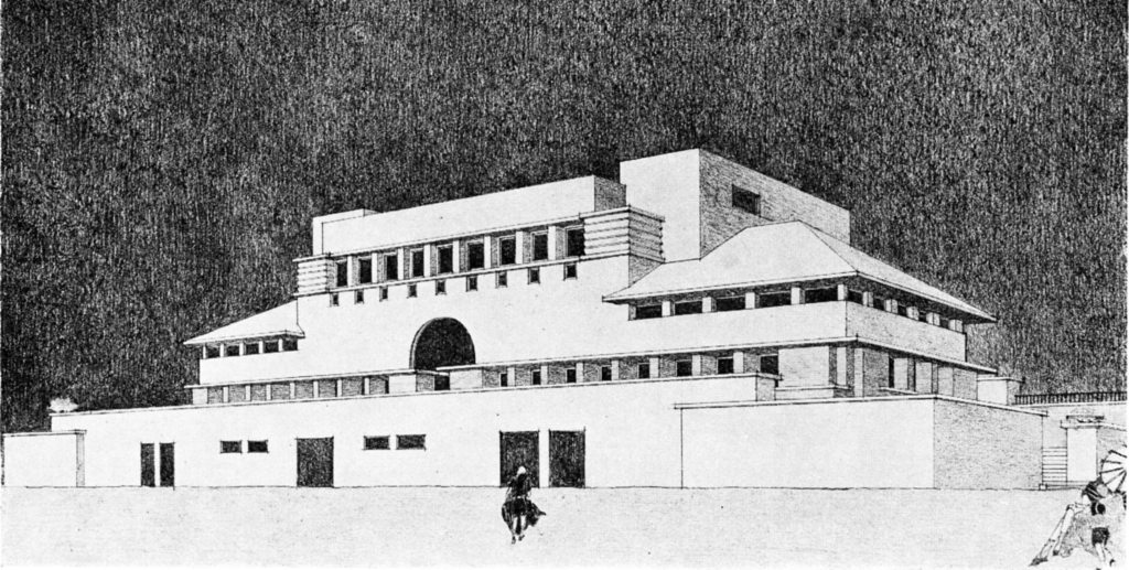 Het ontwerp is opgebouwd uit rechthoekige bouwvolumes. De onderbouw heeft een nadrukkelijke breedte-as. Het horizontale karakter wordt benadrukt door de lintvensters op de etages, maar wordt enigzins afgezwakt door de schilddaken met een sterk overstekende dakrand van de bovenbouw. De symmetrie van het gebouw wordt benadrukt door de centraal gelegen ingangspartij.